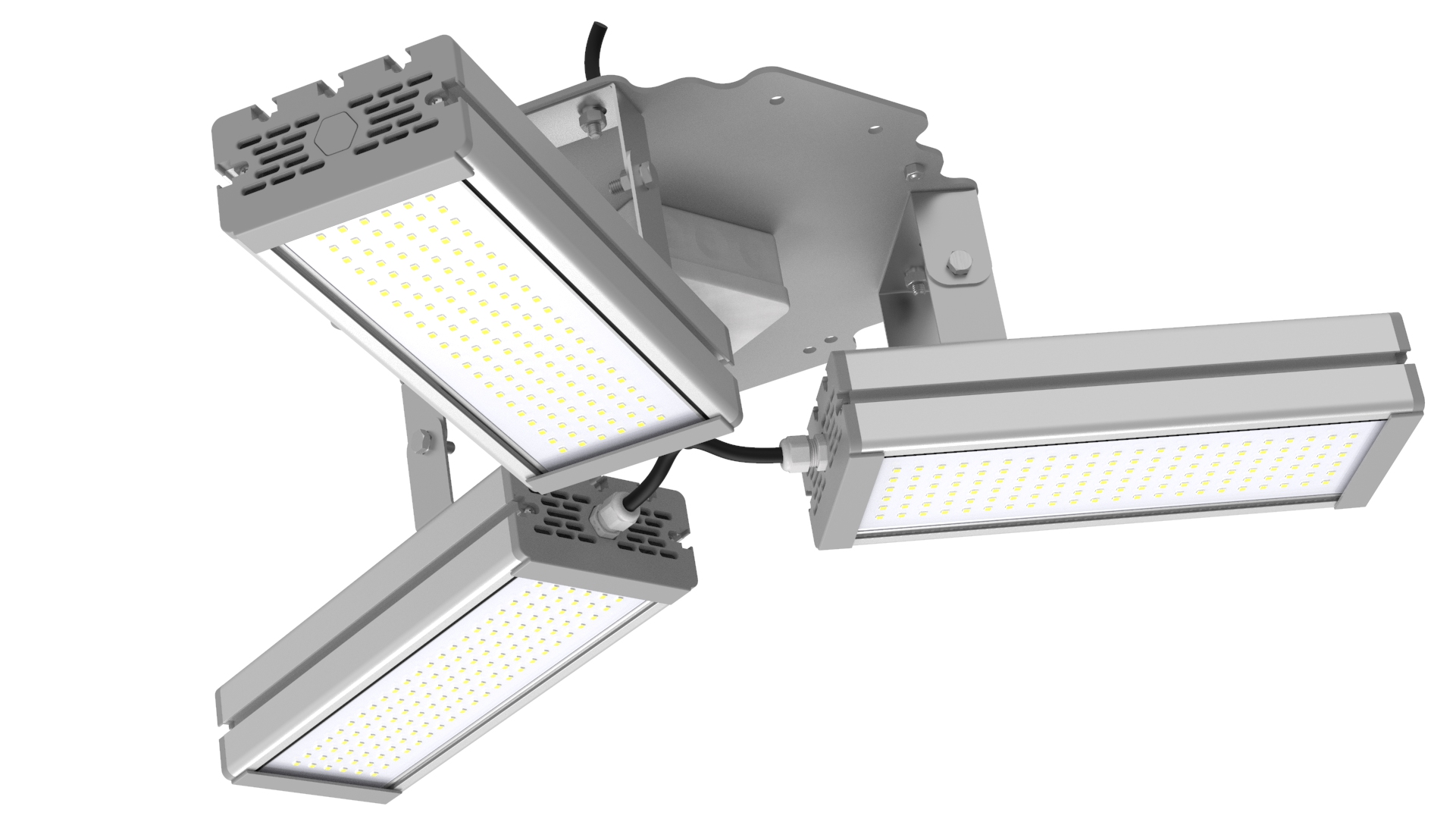 Подвесные промышленные светильники класса High-Bay с креплением на трос в 1 точке. Защита от 380В. Каждая секция имеет регулировку наклона.
