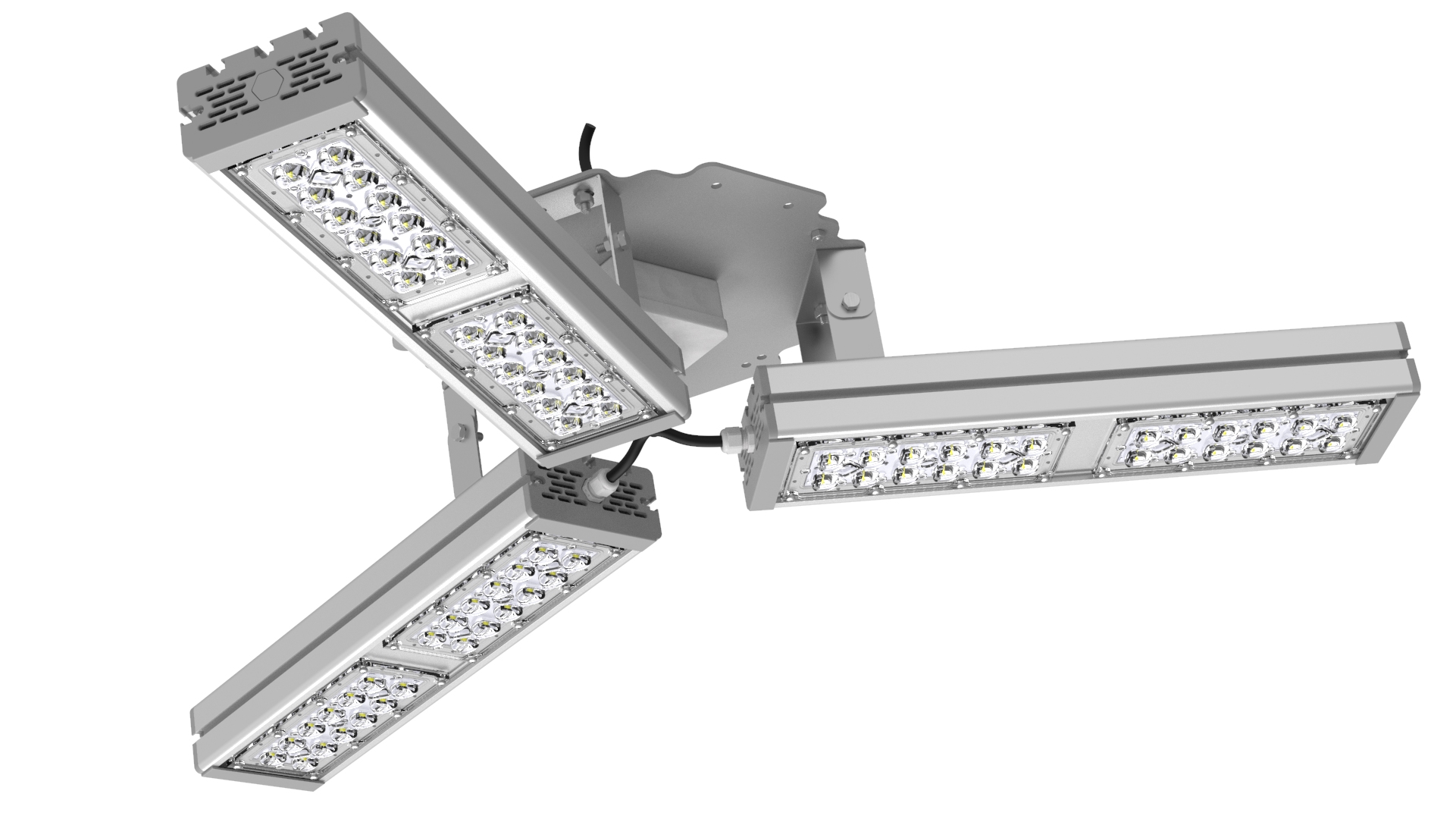 Подвесные промышленные светильники класса High-Bay с креплением на трос в 1 точке. Защита от 380В. Каждая секция имеет регулировку наклона.